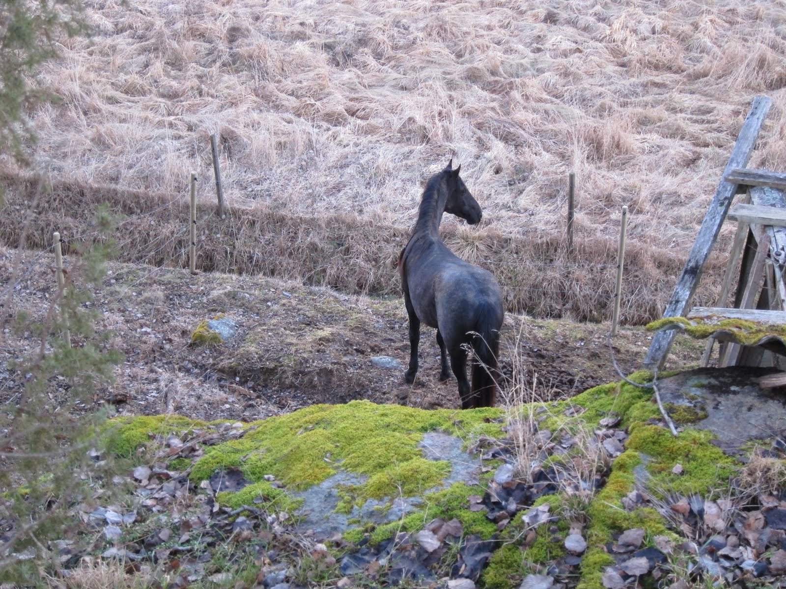 Idag skulle jag ha ridit dressyr på Calinka och tränat vidare med Percy, men maken behövde jobba så jag blev hemma med Isac. Så Isac och jag var uppe vid stallet och matade hästar – Isac bar ut hö från stallet till stona (bild) medan jag fyllde på vatten. Vi försökte leka igång hästarna, men de var inte riktigt på humör även om Pepper var lite sugen och sprang lite. Isac satt på mina axlar och skötte långpisken. På något sätt fick jag en bild…