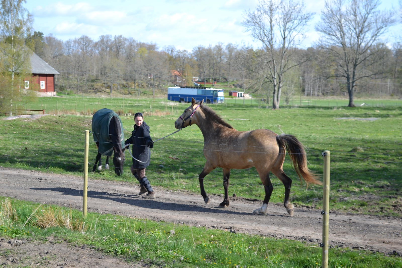 Senare samma dag lyckades jag lämna Percy i hagen efter ridpasset. Inget konstigt med det, jag hade bara glömt att stänga grinden där vi gick ut så jag gick dit för att ordna med det. Percy väntade vid utrustningen och ropade efter sällskap. När jag stängt grinden bad jag henne ge sig iväg (varför hon stanande i första läget var förvånande)… Och hon gick rakt till stallet och där hade vi visst också glömt stänga (båda stona var ju ut och jobbade…) Plötsligt var det bara två eltrådar mellan brunstig Percy och Pepper och hästarna stod nära varandra. Det blev en språngmarch för min del, men inga framben, gnäggningar eller ens hälsningar över staketet. Och jag har nog mest Pepper att tacka för det… Vilken grabb! Däremot måste jag skärpa mig själv – så där får man inte lämna staketen efter sig (eller inte släppa hästen). Och ja, vi har fyra grindar i helt olika ändar av stonas hage…